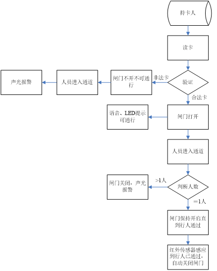 6.若行人不識(shí)別進(jìn)入通道時(shí),閘門(mén)不動(dòng)作禁止行人通行,同時(shí)紅外線傳感器感應(yīng)到有人非法進(jìn)入通道,閘機(jī)聲光告警器鳴響告警(需增加聲光告警器),直至行人退出通道后告警解除,重新讀有效卡方允許通行。