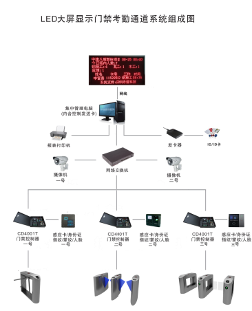 主要由計算機/打印機、智能讀卡器、智能控制器、攝像機、視頻服務(wù)器、智能閘機、智能卡及管理軟件等組成。采用TCP/IP網(wǎng)絡(luò)結(jié)構(gòu)通訊,通訊距離可無限擴展,單臺計算機可接任意數(shù)量智能閘機。智能閘機,既可聯(lián)網(wǎng)運行,又可脫機運行。系統(tǒng)組成圖如下: